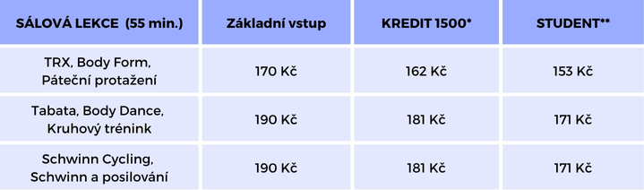 - U sálových lekce hradí karta vstup 1 osoby denně.